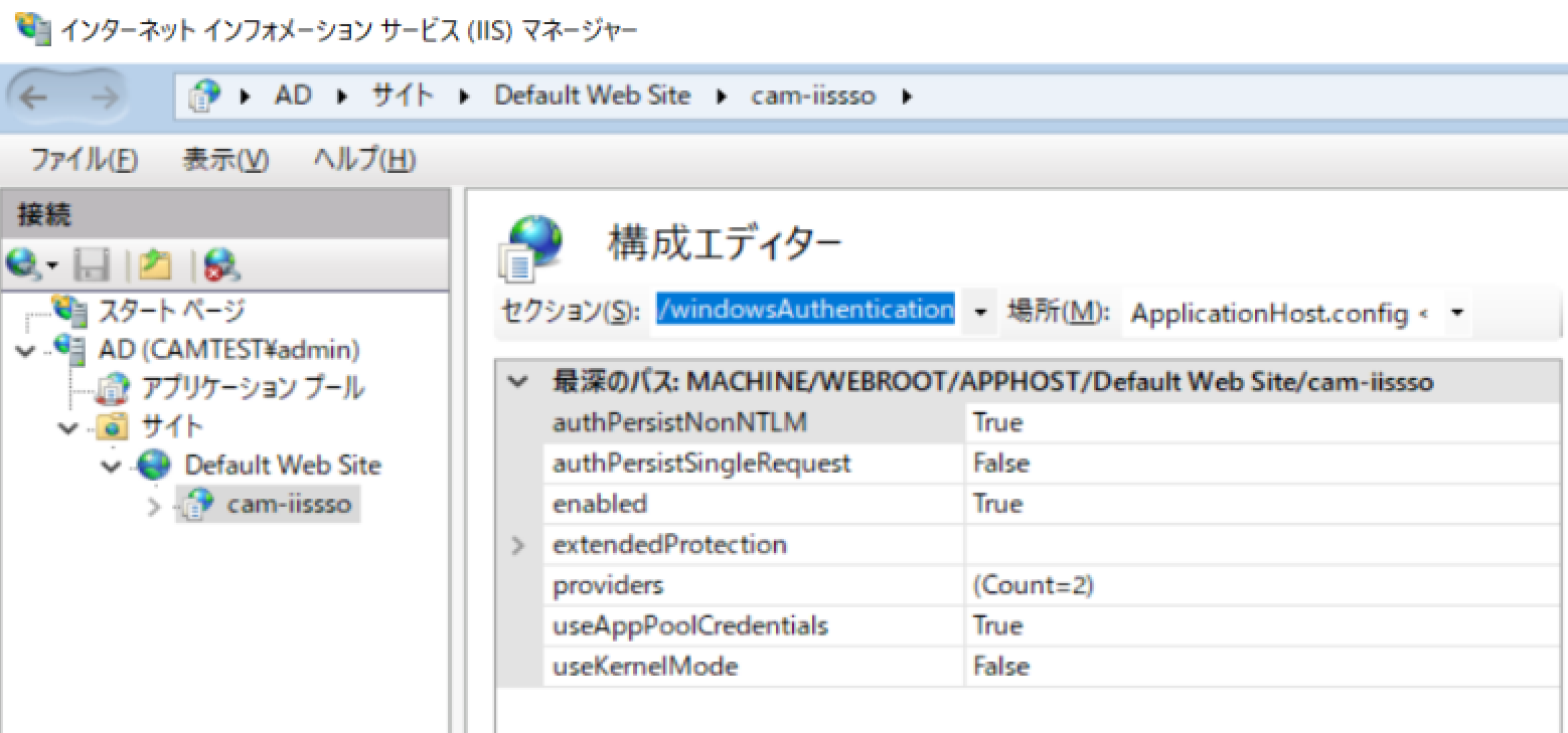 IISアプリケーションプールをサービスアカウントに変更し、Windows認証を正しくKerberosで動作させるためには、IISマネージャーの「構成エディター」機能で次の設定を行う必要があります: