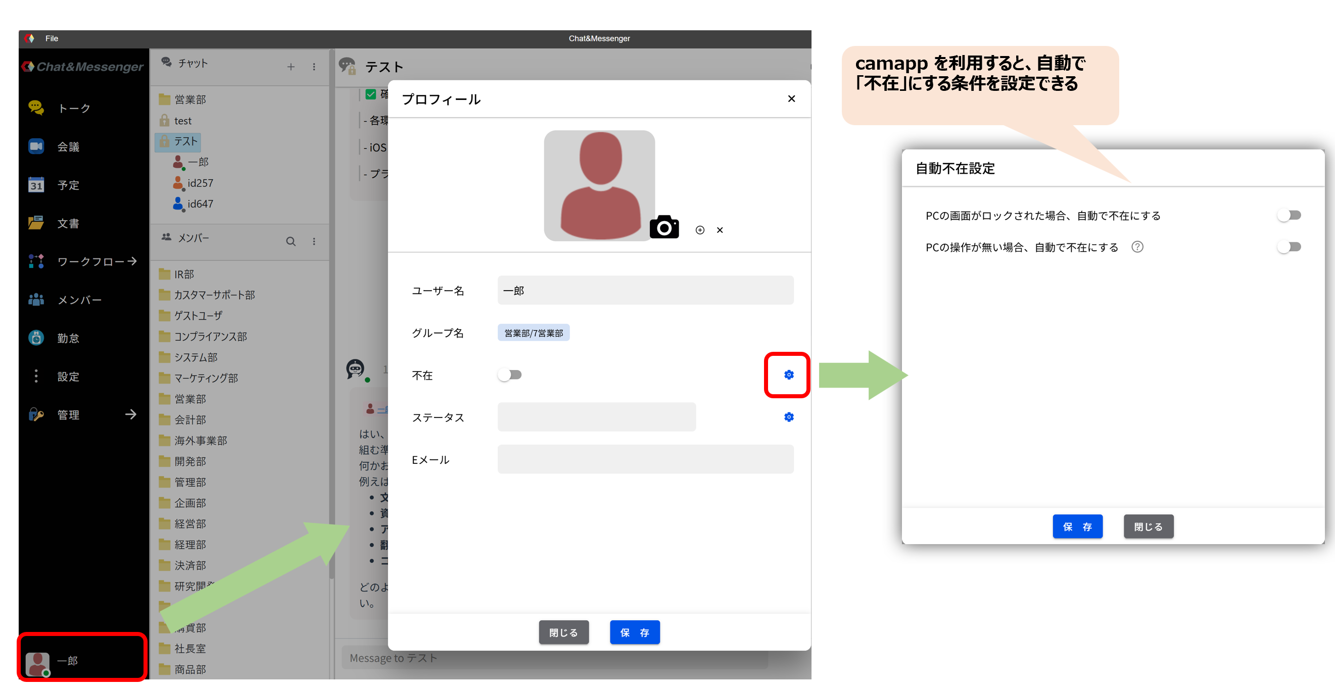 부재 설정으로 하면, 다른 유저의 유저 리스트에 [ 부재]라고 표시되므로, 부재인 일, 곧바로 회신을 할 수 없는 일등을 알릴 수가 있습니다.